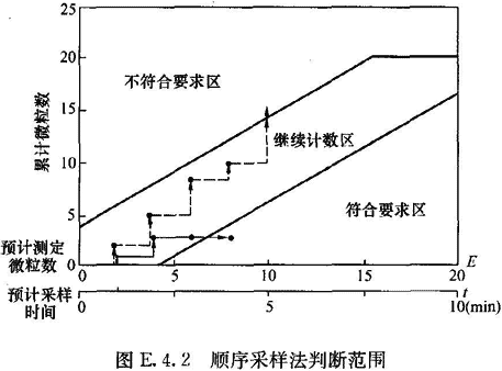 13 對(duì)于需要很大采樣量、耗時(shí)很大的某粒徑微粒的檢測(cè),可采用順序采樣法,即將每次測(cè)定結(jié)果標(biāo)注于圖E.4.2上,當(dāng)標(biāo)注點(diǎn)落入不合格區(qū)時(shí),即停止檢測(cè),結(jié)果為不達(dá)標(biāo);當(dāng)標(biāo)注點(diǎn)落入合格區(qū)時(shí),停止檢測(cè),結(jié)果為達(dá)標(biāo);當(dāng)標(biāo)注點(diǎn)一直在繼續(xù)區(qū)中延伸,而總采樣量已達(dá)到表E.4.2—2的最小采樣量,累計(jì)微粒數(shù)仍小于20,即停止檢測(cè),結(jié)果為達(dá)標(biāo);當(dāng)標(biāo)注點(diǎn)一直在繼續(xù)區(qū)中延伸,而總采樣量未達(dá)到最小采樣量,但累計(jì)微粒數(shù)已超過(guò)20,即停止檢測(cè),結(jié)果為不達(dá)標(biāo)。