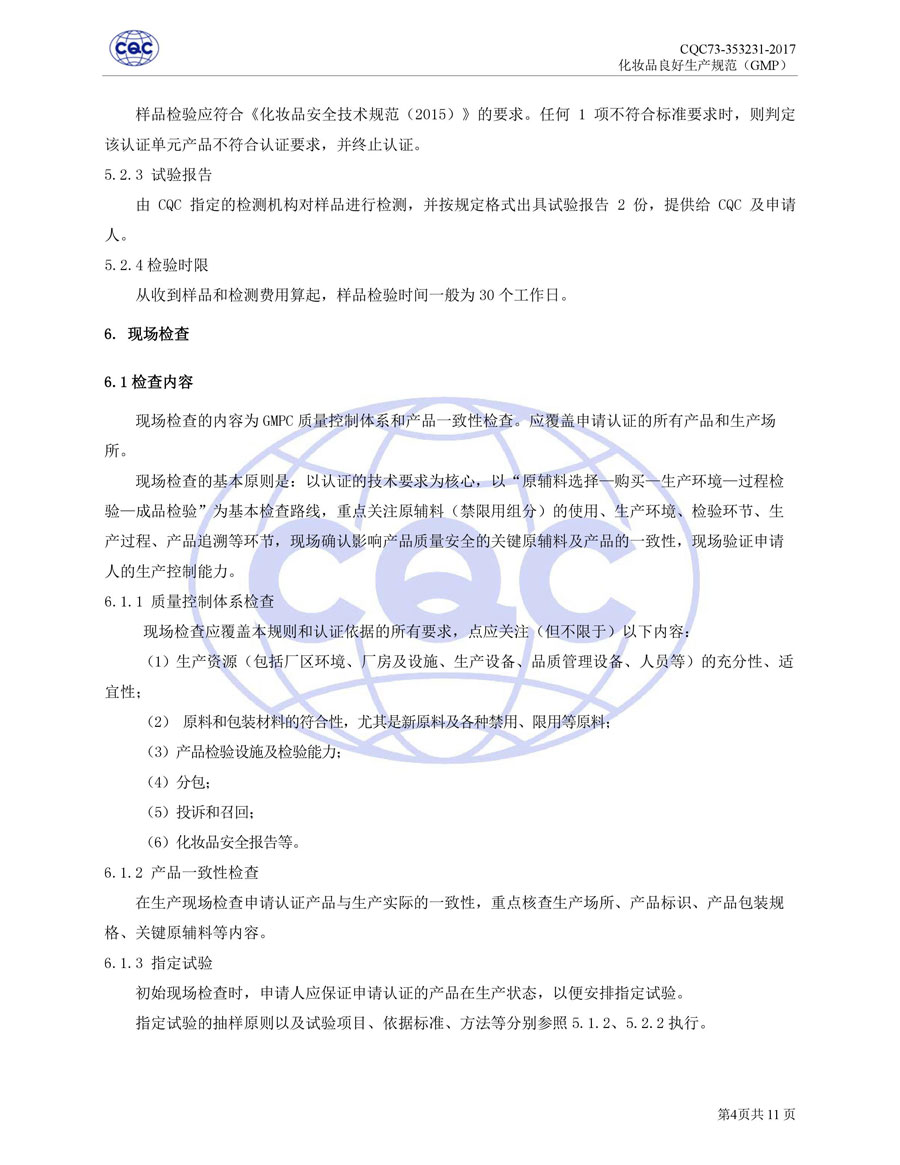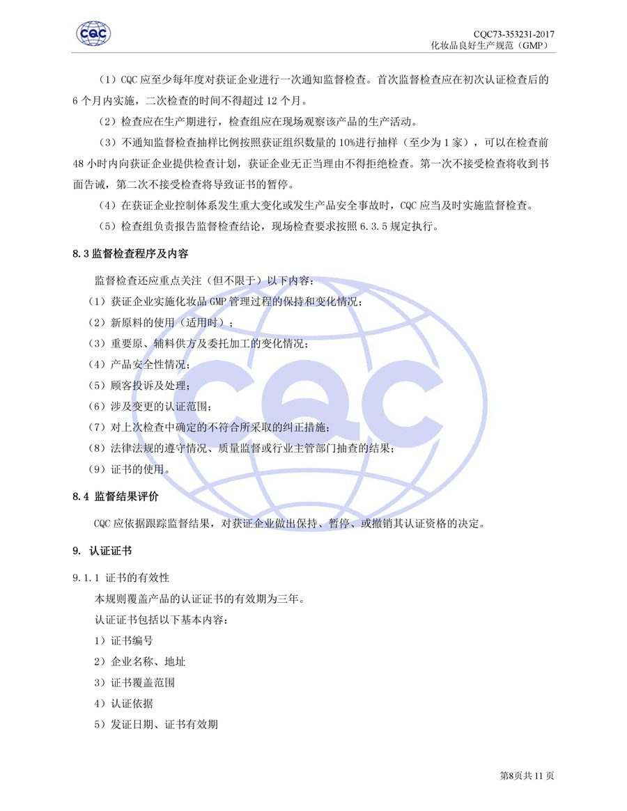認(rèn)證依據(jù)為美國(guó)農(nóng)業(yè)部《Cosmetic Good Manufacturing Practice Guideline》, European Federation for Cosmetic Ingredients (EFfIC)-GMP for cosmetic ingredient,ISO 22716-2007《化妝品良好生產(chǎn)規(guī)范》、CQC73-353231-2016《化妝品認(rèn)證實(shí)施規(guī)則》及適用的法律法規(guī)等。