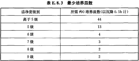 7 培養(yǎng)皿數(shù)應(yīng)不少于微粒計(jì)數(shù)濃度的測(cè)點(diǎn)數(shù),如工藝無(wú)特殊要求應(yīng)大于等于表E.8.3中的最少培養(yǎng)皿數(shù),另外各加1個(gè)對(duì)照皿。