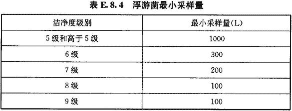 4 每點(diǎn)采樣1次,如工藝無(wú)特殊要求,每次采樣量應(yīng)大于等于表E.8.4推薦的浮游菌最小采樣量。