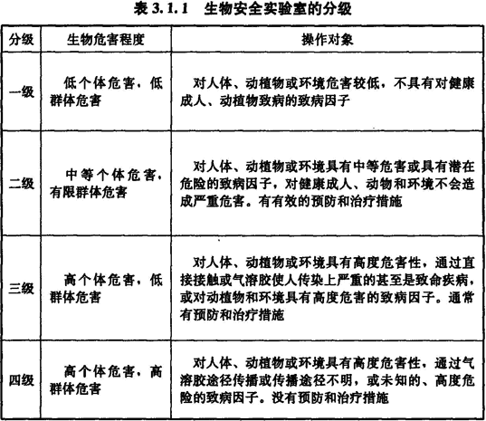 3.1.2 根據(jù)實驗室所處理對象的生物危害程度和采取的防護(hù)措施,生物安全實驗室分為四級。微生物生物安全實驗室可采用BSL-1、BSL-2、BSL-3、BSL-4表示相應(yīng)級別的實驗室;動物生物安全實驗室可采用ABSL-1、ABSL-2、ABSL-3、ABSL-4表示相應(yīng)級別的實驗室。生物安全實驗室應(yīng)按表3.1.1進(jìn)行分級。