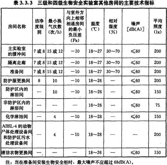 3.3.3 三級和四級生物安全實驗室其他房間的主要技術(shù)指標(biāo)應(yīng)符合表3.3.3的規(guī)定。