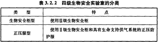 3.2.2 四級生物安全實驗室根據(jù)使用生物安全柜的類型和穿著防護(hù)服的不同,可分為生物安全柜型和正壓服型兩類,并可符合表3.2.2的規(guī)定。