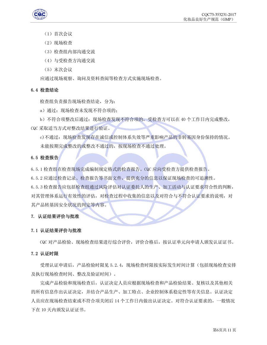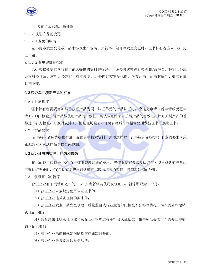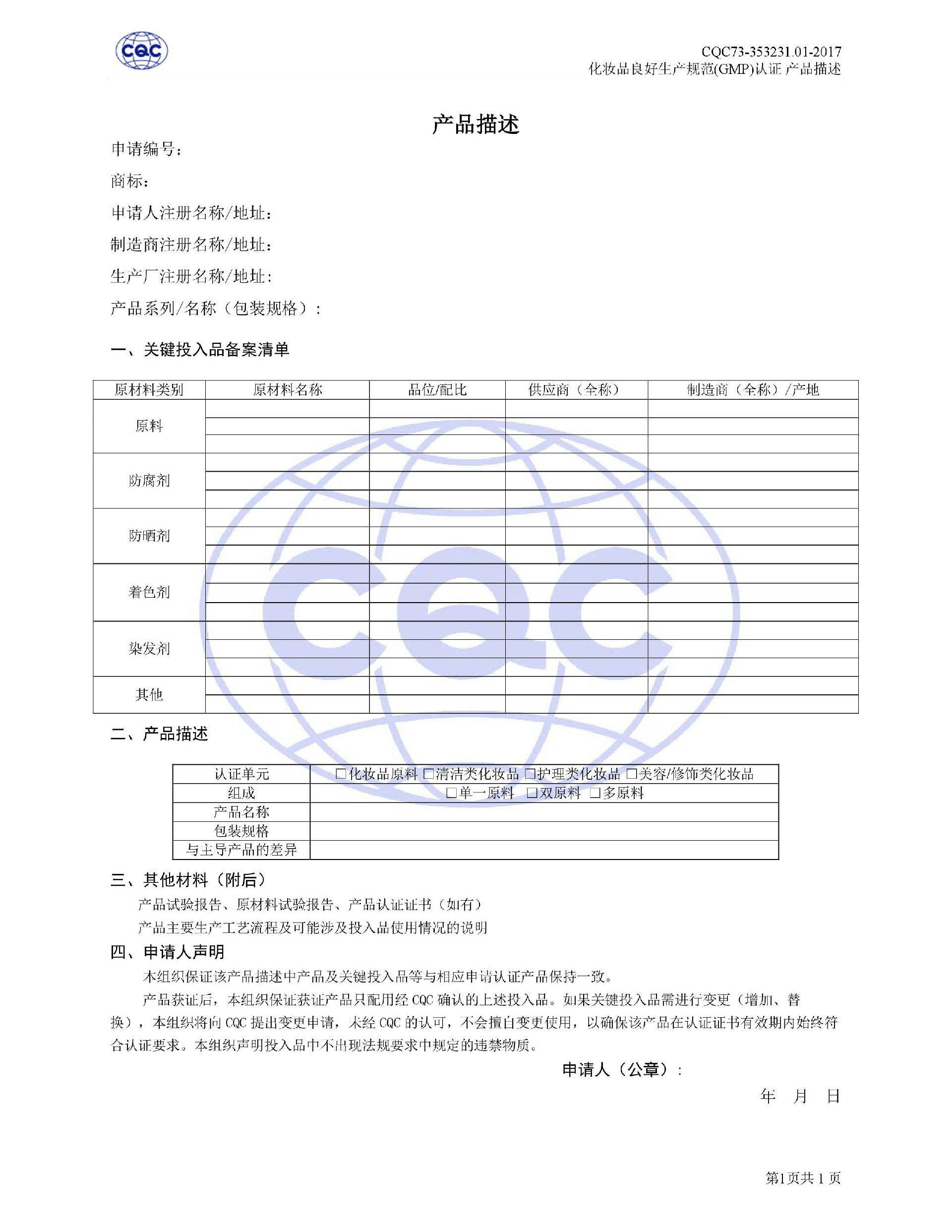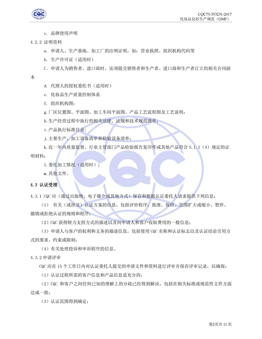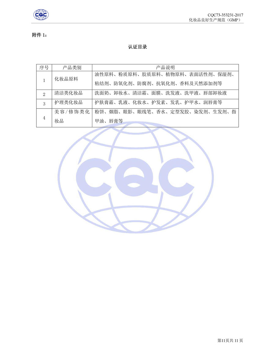 認(rèn)證依據(jù)為美國(guó)農(nóng)業(yè)部《Cosmetic Good Manufacturing Practice Guideline》, European Federation for Cosmetic Ingredients (EFfIC)-GMP for cosmetic ingredient,ISO 22716-2007《化妝品良好生產(chǎn)規(guī)范》、CQC73-353231-2016《化妝品認(rèn)證實(shí)施規(guī)則》及適用的法律法規(guī)等。